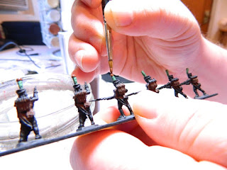 I sort the infantry by pose and glue six figures per stick. The Glue-All provides a solid enough bond that the figures do not fall off during painting, but the bond is weak enough that I can remove the figures with my hands when they are done.